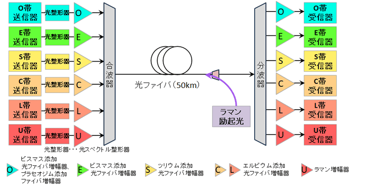 これまでNICTは、商用の長距離光ファイバ伝送システムで利用されている波長帯(C帯、L帯)に加え、一般的に商用化されていないS帯、E帯を利用可能にした光ファイバ伝送システムを開発し、大容量伝送を実証してきました。更なる大容量化を実現するためには、新たにO帯、U帯を利用して波長帯を拡大する必要がありますが、これら全ての波長帯に対応した光ファイバ伝送システムは実現されていませんでした。